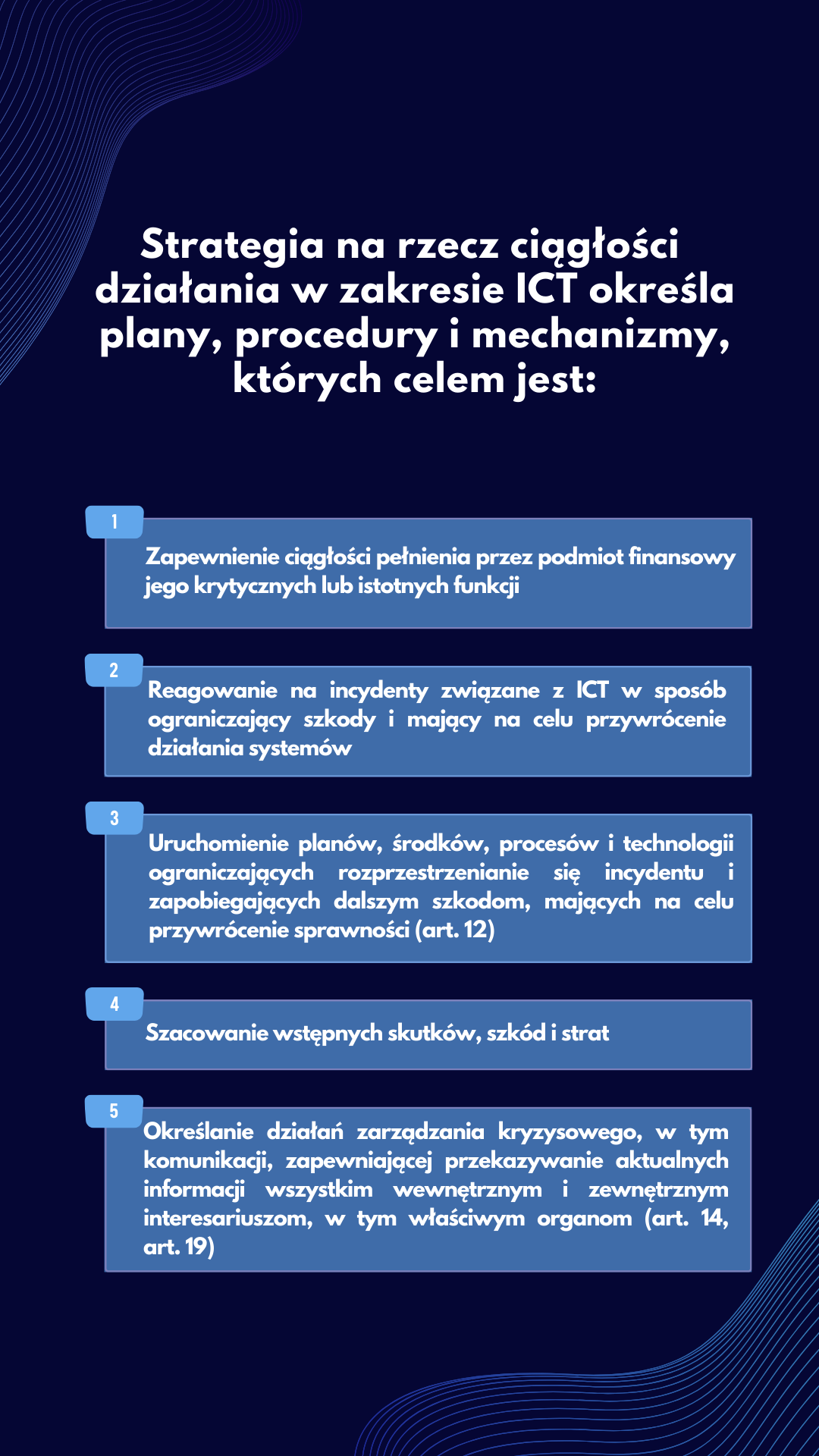 Zgodnie z art. 12 Rozporządzenia DORA w celu zapewnienia przywrócenia systemów ICT i danych przy minimalnej przerwie, ograniczonych zakłóceniach i stratach, w kontekście ram zarządzania ryzykiem związanym z ICT podmioty finansowe opracowują i dokumentują: