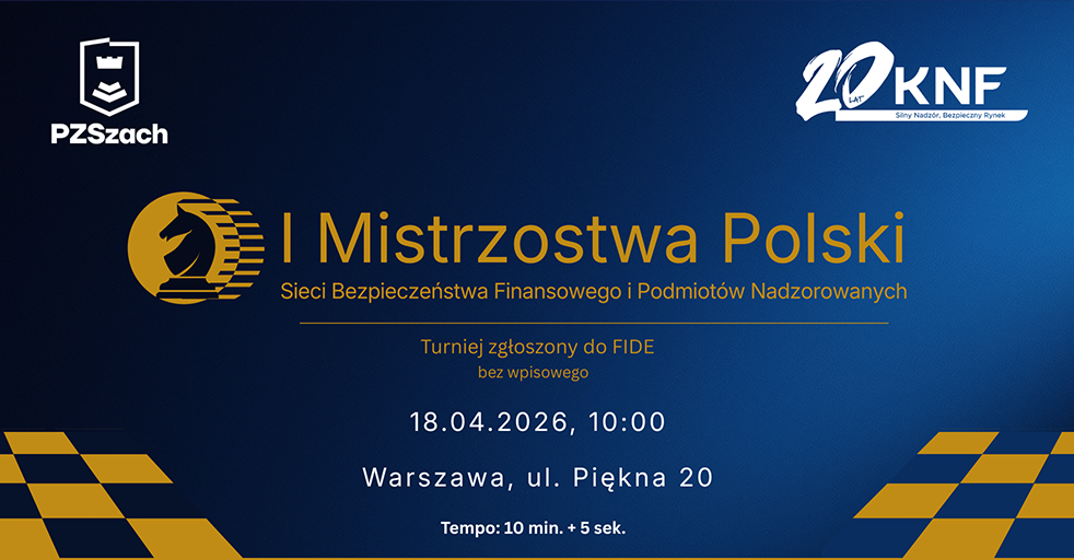 18 kwietnia 2026 roku w siedzibie UKNF przy ul. Pięknej 20 odbędą się I Mistrzostwa Polski Sieci Bezpieczeństwa Finansowego i Podmiotów Nadzorowanych. Pracownicy instytucji sieci bezpieczeństwa finansowego, a także nadzorowanych podmiotów sektora finansowego oraz firm audytorskich, zasiądą do szachownic i powalczą o tytuł Mistrzyni i Mistrza Polski, a także Drużynowych Mistrzów Polski. Na zgłoszenia czekamy do 14 kwietnia.
