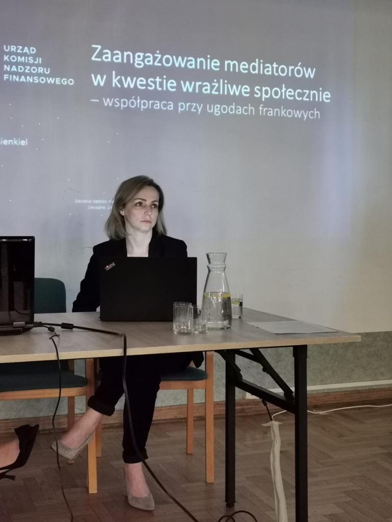 Magdalena Gronowska-Sienkiel, Dyrektor Gabinetu Komisji w Urzędzie KNF, podczas szkolenia dla Sędziów Koordynatorów ds. Mediacji zorganizowanego przez Ministerstwo Sprawiedliwości, które odbyło się w Zakopanem, przedstawiła sędziom założenia programu mediacji dla klientów banków posiadających kredyty w CHF oraz banków, realizowanego przez Sąd Polubowny przy Komisji Nadzoru Finansowego. Rozmowy dotyczyły m.in. korzyści płynących z pozasądowego trybu rozwiązywania sporów. Program oparty o założenia przedstawione w grudniu ubiegłego roku przez Jacka Jastrzębskiego, Przewodniczącego KNF, ruszył w październiku br. Pierwsze efekty to 5 tys. wniosków o mediacje oraz 4 tys. umówionych spotkań mediacyjnych. 25 października zawarta została pierwsza ugoda klienta z bankiem.