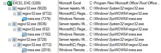 Złośliwy skrypt XLM 4.0 uruchamia pobrane wcześniej biblioteki, czyniąc regsvr32.exe procesem podrzędnym wobec EXCEL.EXE. Kolejny krok stanowi wywołanie pliku msra.exe z poziomu złośliwej biblioteki DLL.